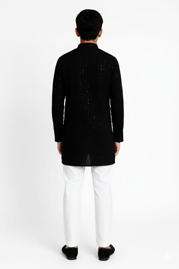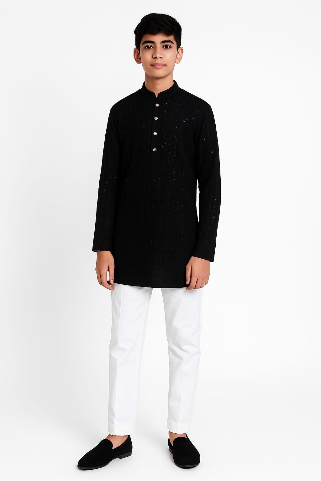 This sophisticated Kurta and Pant set is designed for young men who appreciate traditional style with a modern touch. The black kurta features subtle sequin work for a festive shimmer, perfectly paired with contrasting white pants, making it ideal for special occasions, family gatherings, and celebrations.