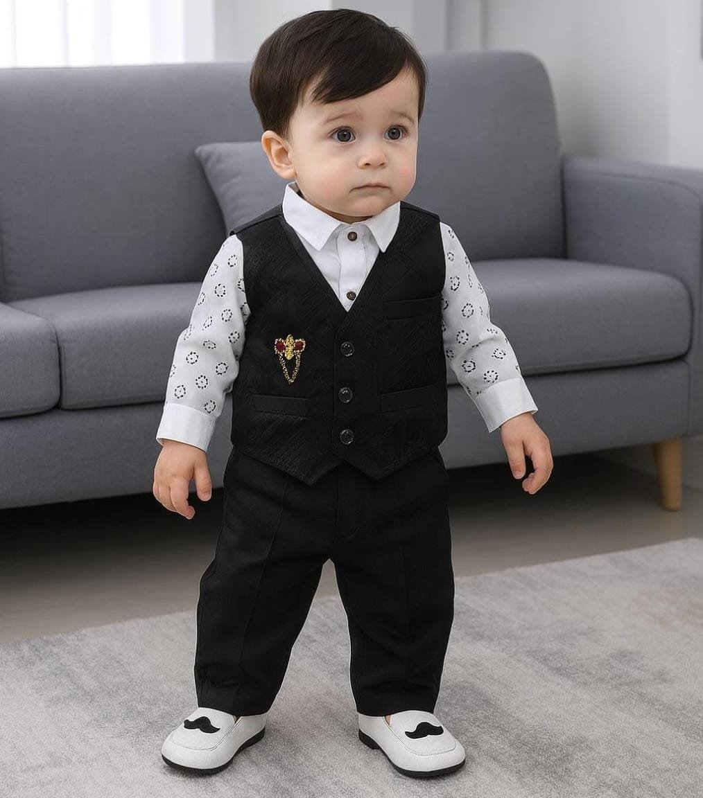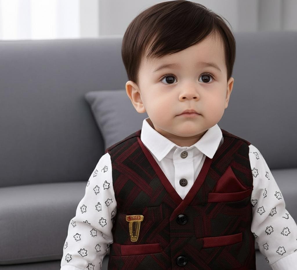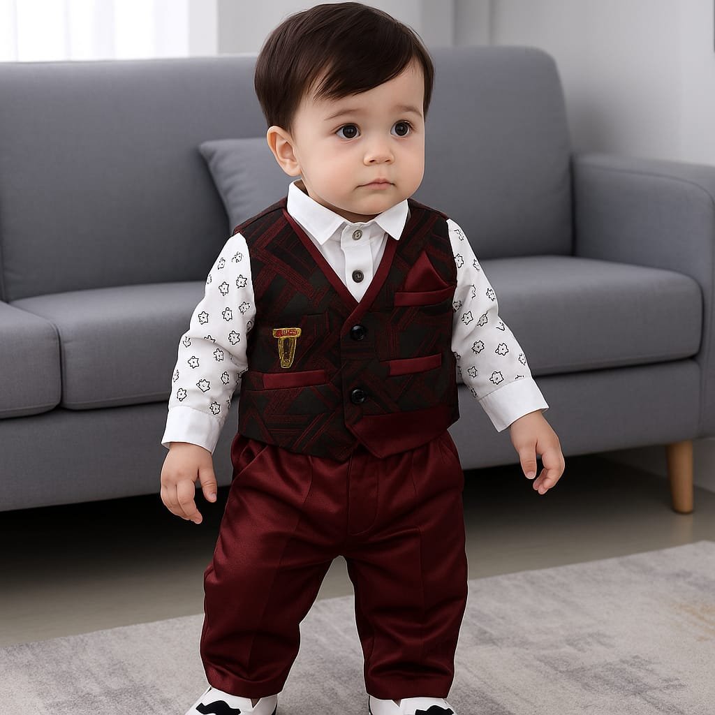 This stunning 3-piece set is designed to give your little one a smart and sophisticated look for any special occasion. The rich maroon and black design, combined with luxurious fabric, makes it perfect for birthdays, weddings, or festive events.