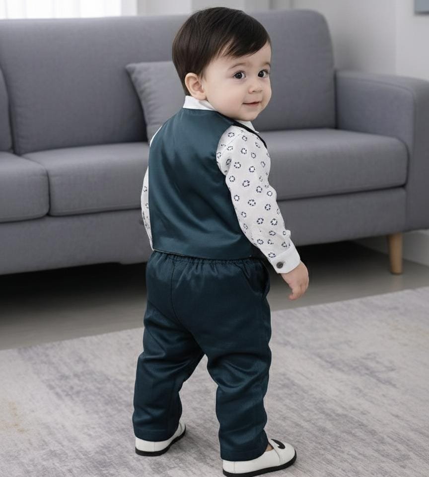 3-Piece Set Includes: 1 Designer Waistcoat, 1 Soft Cotton Printed Shirt, and 1 Matching Silk Blend Pant.