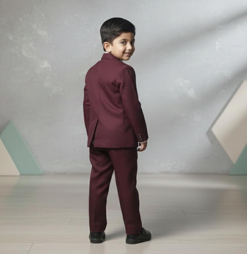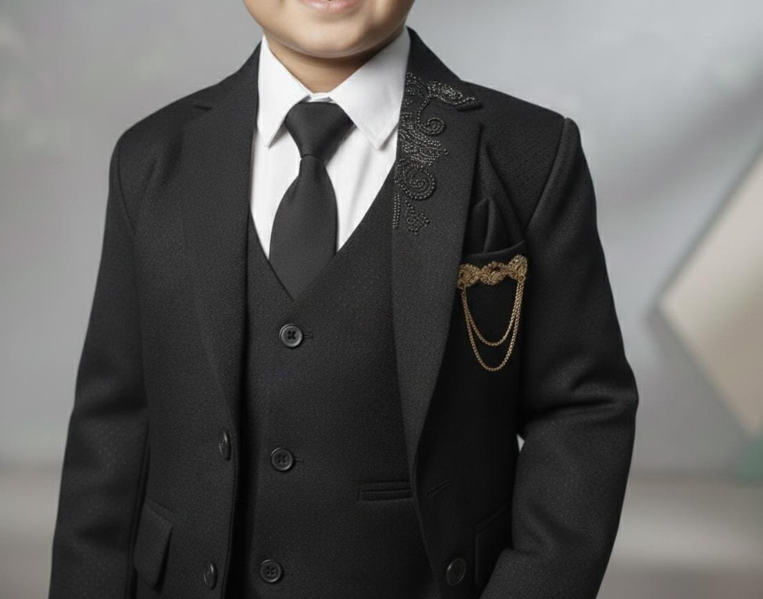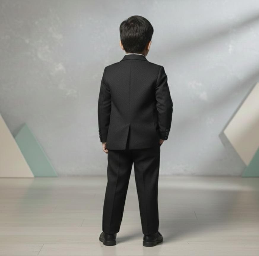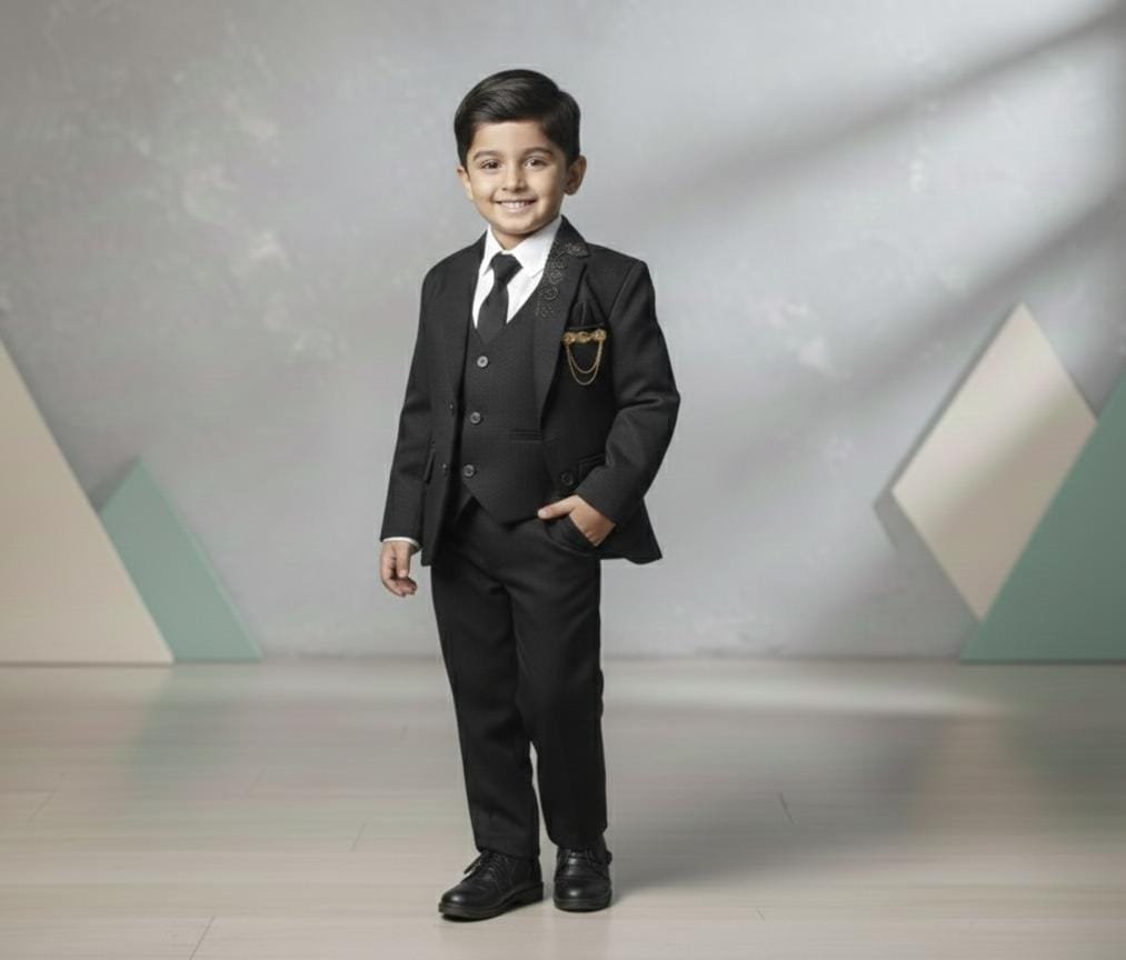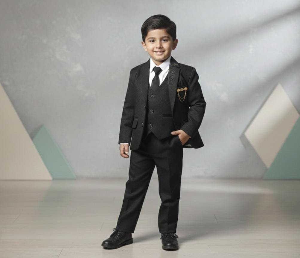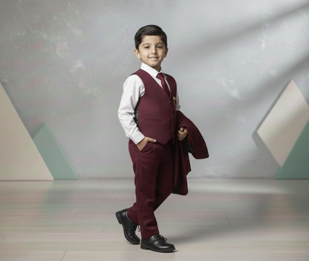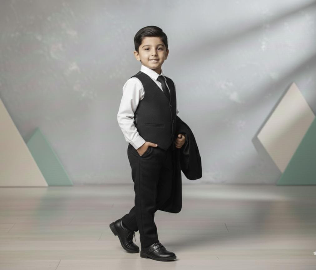 This sophisticated 5-piece formal suit set is designed to give your child a smart, refined, and dashing look for any special occasion. It is a perfect blend of high-quality fabric and meticulously tailored design.