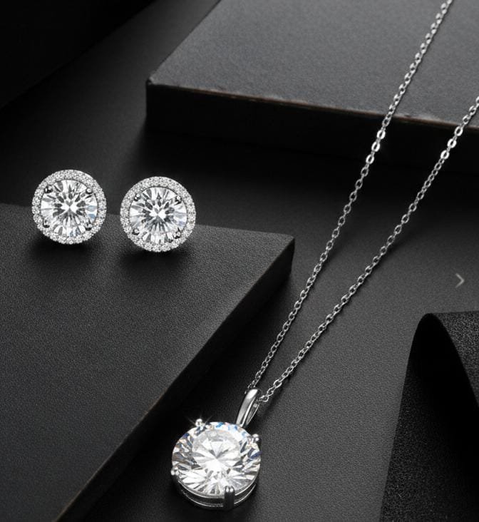 Elevate your style with the timeless brilliance of our D Color Moissanite Jewelry Set. Crafted for the modern woman who appreciates luxury and sophistication, this set features a stunning solitaire pendant necklace and matching stud earrings. Each stone is hand-selected to ensure maximum fire and sparkle, making it a perfect alternative to traditional diamonds.
