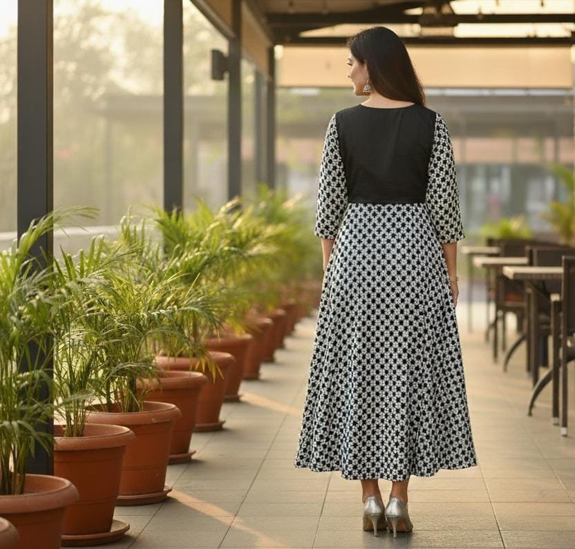 This sophisticated gown dress brings a touch of effortless glamour to any occasion. Designed with a fitted black bodice and a flowing lower half, it creates a flattering silhouette that suits various body types. The garment is crafted from a luxurious, high-quality net fabric that drapes beautifully, giving it a rich texture and subtle sheen. The timeless black and white color blocking, featuring solid black on the upper body and a contrasting patterned lower skirt, ensures a graceful and eye-catching look without relying on surface prints.