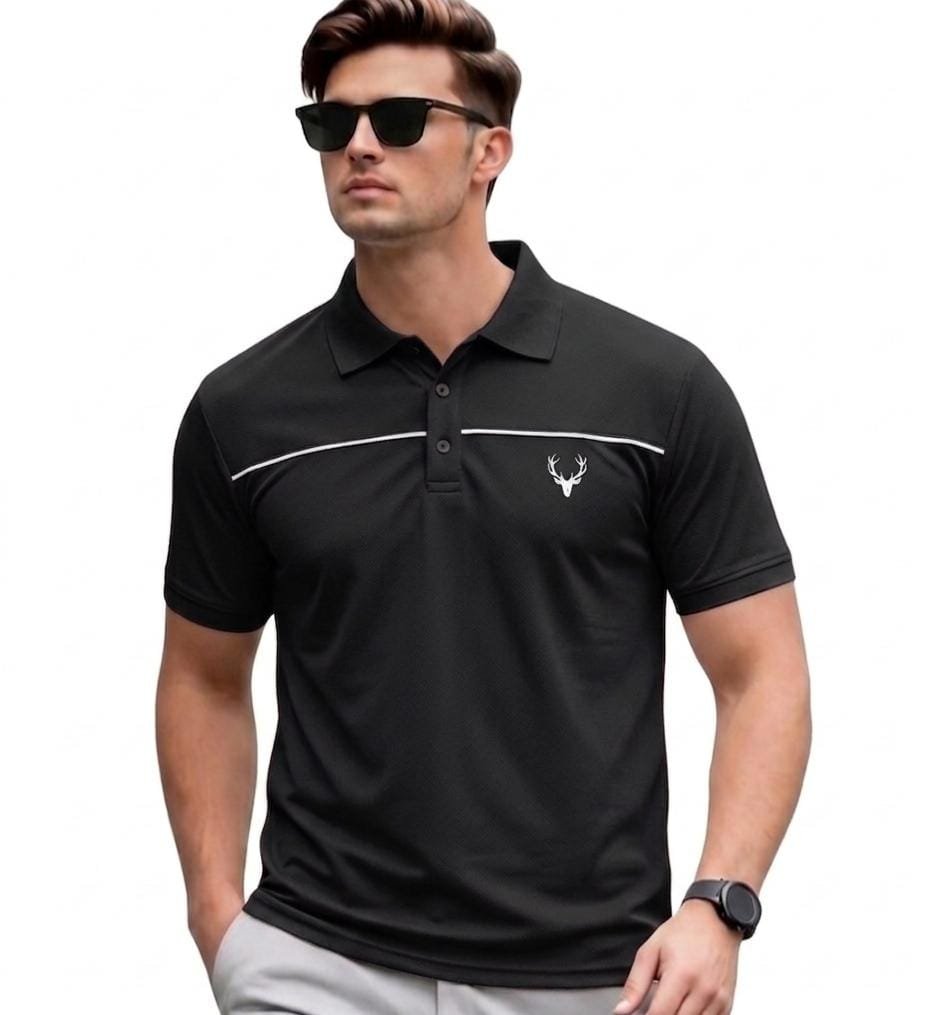 Designed with a classic polo collar and a structured button placket, this t-shirt features a subtle chest stripe and minimal logo detailing, adding a modern yet understated appeal. The tailored fit enhances the silhouette, making it suitable for both casual and semi-formal occasions.
